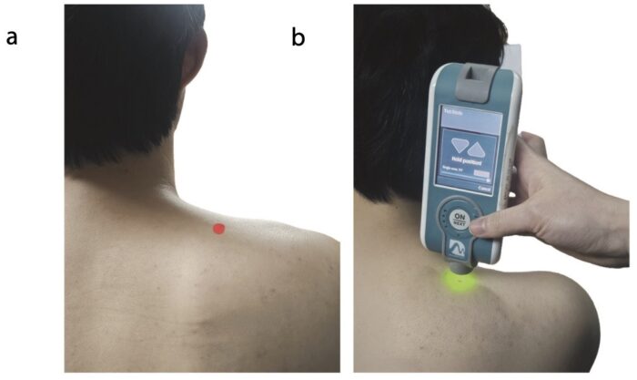Figure 3. MyotonPRO probe location (a. Measurement location, b. MyotonPRO placement)