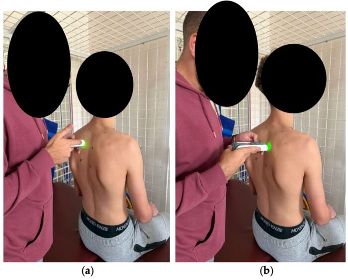 Figure 8. Myotonometric measurement of the middle trapezius muscle (a) left (b) right.